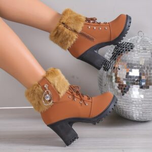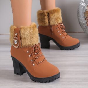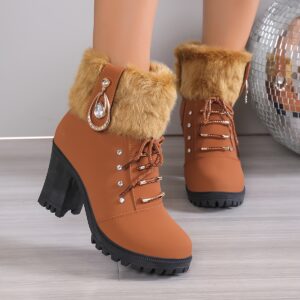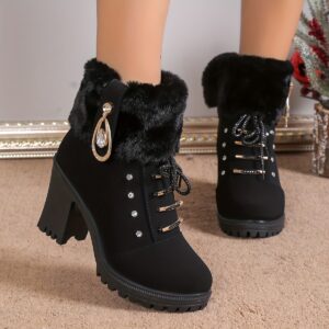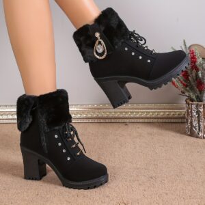 Women’s Fashionable Black Lace-Up Winter Boots with Fluffy Fur Trim